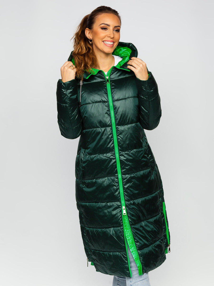 Zielona długa pikowana kurtka damska zimowa z kapturem