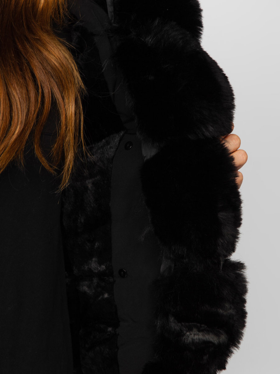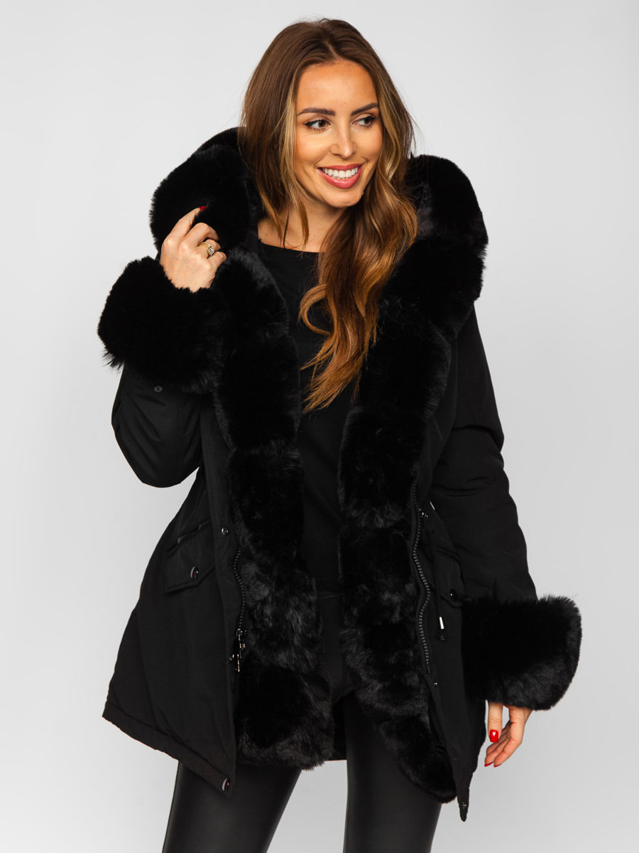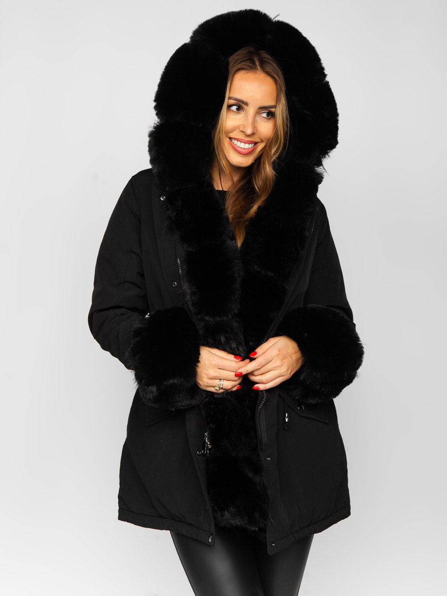 Trzecia propozycja jest niesamowicie zjawiskowa i na pewno spodoba się kobietom, które lubią się wyróżniać. To gładka, czarna kurtka z futerkowymi obszyciami na obszernym kapturze oraz przy rękawach. Każde z futerek (także to wzdłuż zapięcia z przodu) jest odpinane, co pozwala nosić kurtkę na kilka sposobów. Kurtka posiada regulację w pasie sznurkiem, można ją zatem dopasować do sylwetki. Od wewnątrz jest ocieplana, dlatego nadaje się nawet na największe mrozy. Ten model występuje tylko w tym jednym, czarnym kolorze oraz w czterech rozmiarach.