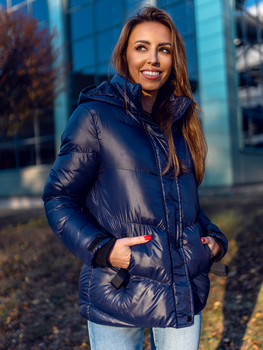 Granatowa pikowana kurtka damska zimowa z kapturem