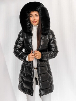 Czarna długa pikowana kurtka damska zimowa z kapturem Denley 7089A