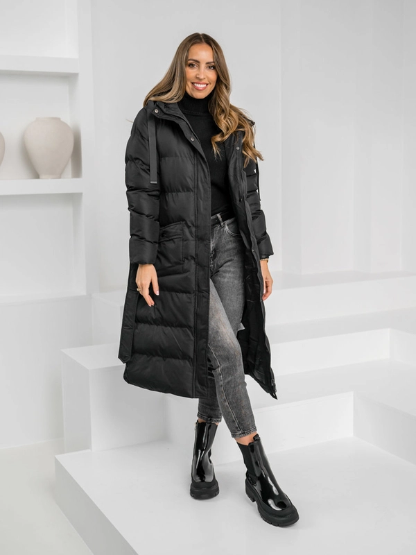 Czarna długa pikowana kurtka płaszcz damska zimowa z kapturem Denley 5M3178