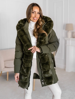 Khaki długa pikowana kurtka płaszcz damska zimowa z kapturem Denley 5M3158