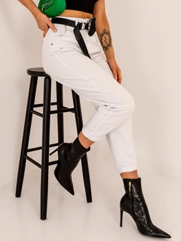 Białe jeansowe spodnie damskie z wysokim stanem i paskiem z saszetką Denley LA688A