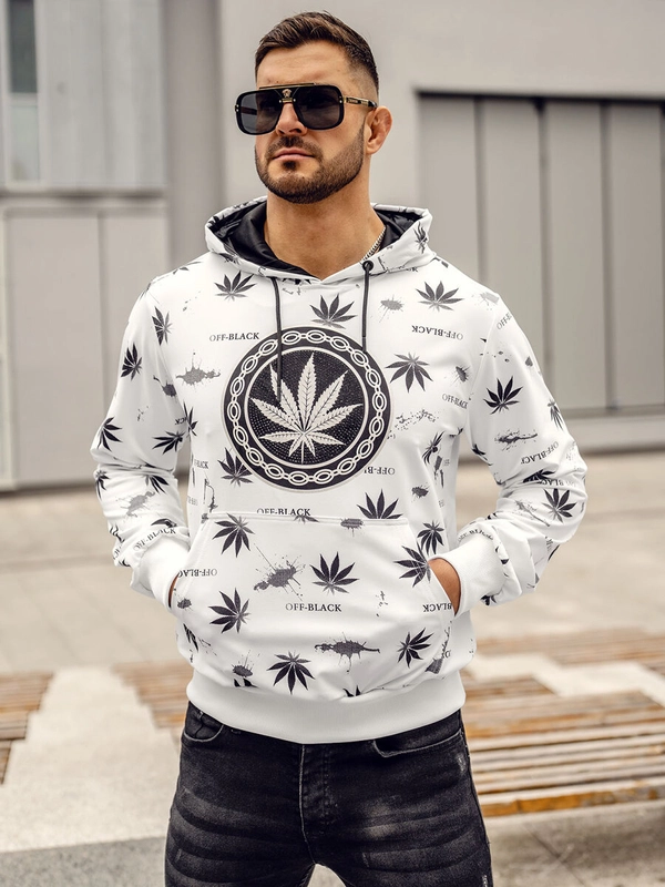 Biała bluza męska z kapturem kangurka z nadrukiem Denley 8B1101A