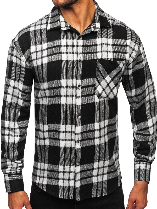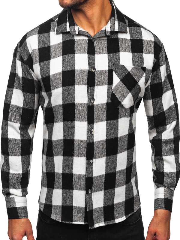 Biało-czarna koszula męska flanelowa w kratę z długim rękawem Denley 2025-1