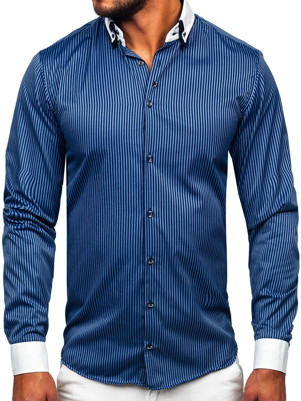 Koszula męska elegancka w paski z długim rękawem granatowa Bolf 0909-A
