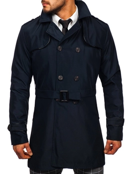 Granatowy dwurzędowy płaszcz męski prochowiec z wysokim kołnierzem i paskiem Denley 0001